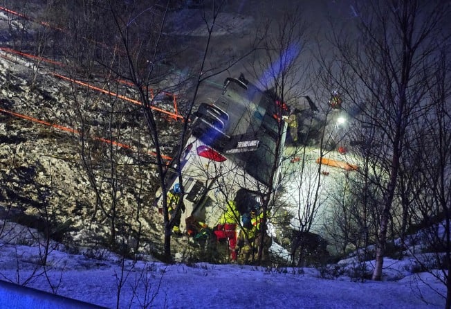 A bus carrying several foreign tourists went off the road and ended up partially submerged in a lake near the Raftsundet strait that separates the Lofoten archipelago from the Norwegian mainland, killing three people and injuring four, police said Thursday.