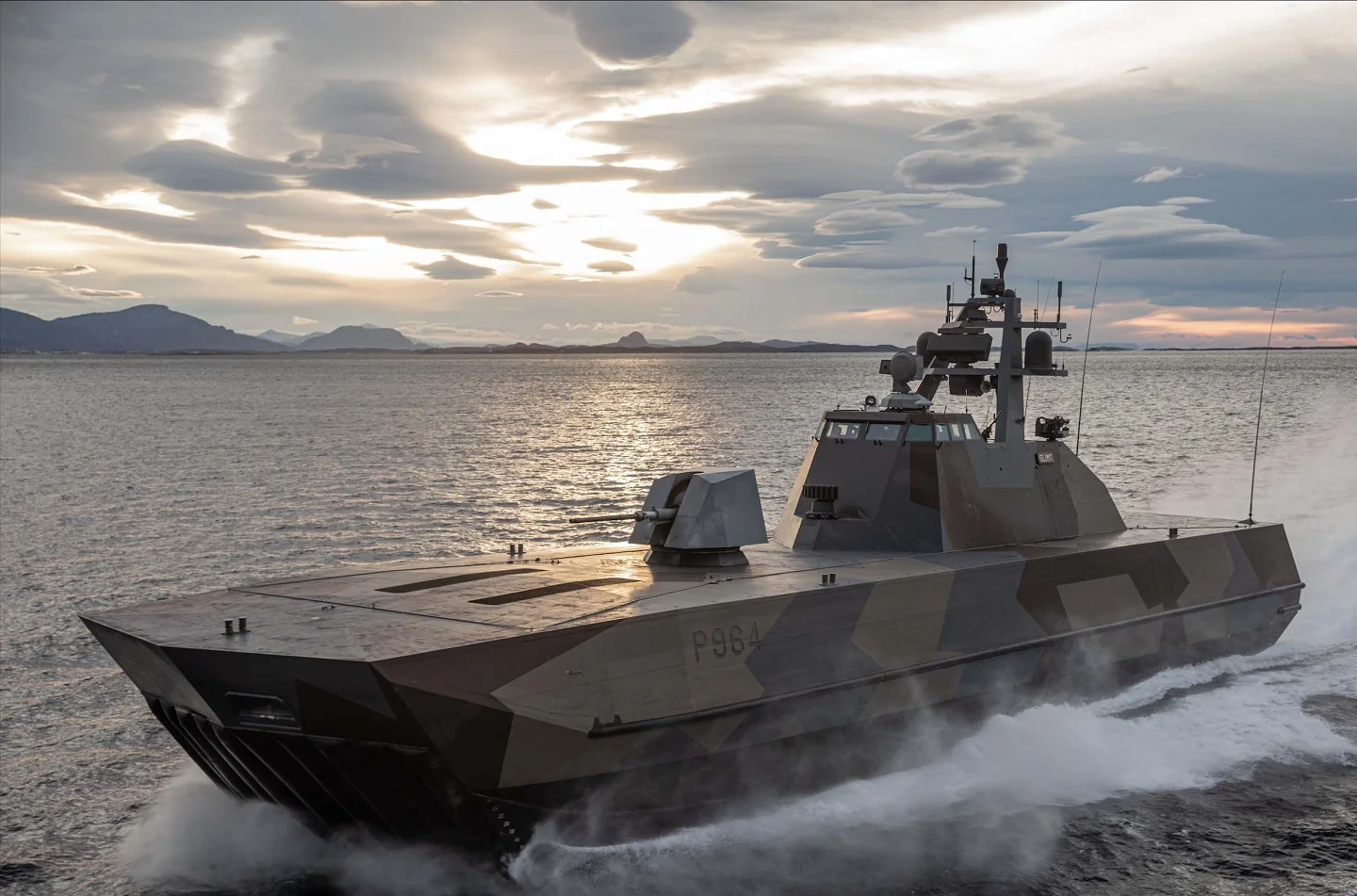 As part of the Joint Expeditionary Force (JEF) efforts to hone defence co-operation, British and Norwegian patrol vessels are tested in and around the many bays and jagged coast around fjords in Norway on 13 April 2023.
