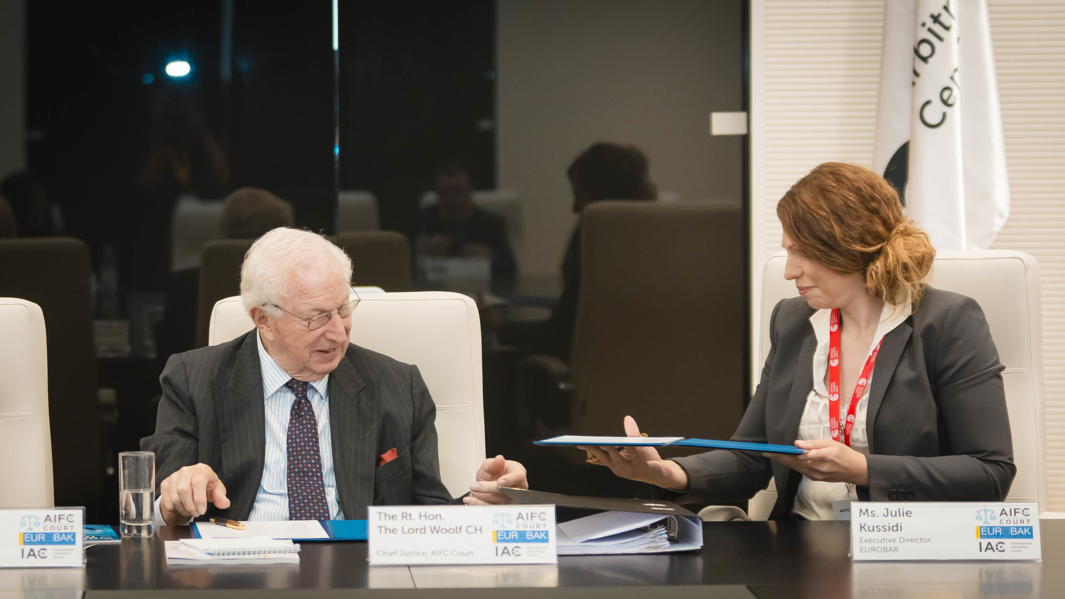 The signing ceremony was organised in the framework of a joint roundtable within the Astana Finance Days. The roundtable was opened by Mr. Christopher Campbell-Holt, Registrar and Chief Executive of the AIFC Court and IAC, with contributions from The Rt. Hon. The Lord Woolf CH, AIFC Court Chief Justice, Barbara Dohmann QC, IAC Chairman, H.E. Sven-Olov Carlsson, Ambassador, Head of the EU Delegation to Kazakhstan and EUROBAK Honorary Board Member, and Julie Kussidi, EUROBAK Executive Director.