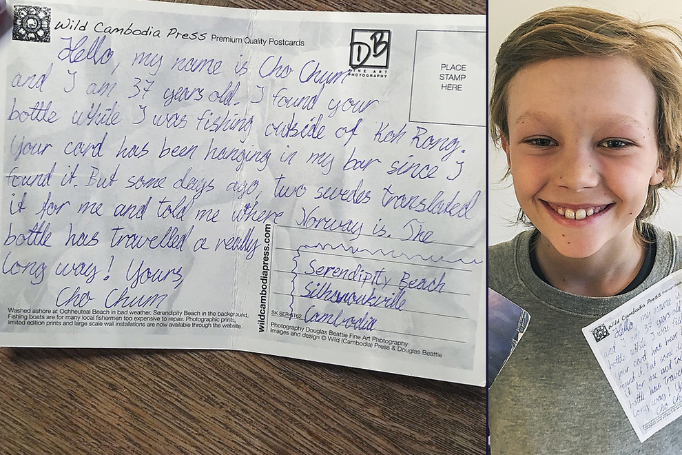 In the summer of 2013, the seven year old Mingus Lund threw at Coca Cola bottle with a postcard inside into the ocean by Geitskjæret on Nøtterøy near the town of Tønnsberg in Norway. The photo showed the famous cliff Prekestolen in Norway. On the other side of the card, Mingus wrote – with the help of his cousin: