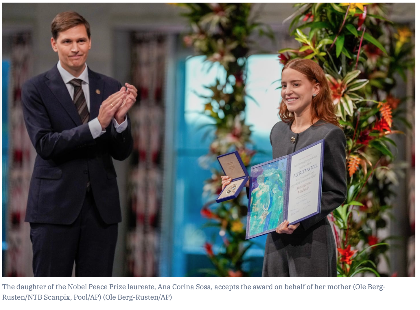 Her daughter, Ana Corina Sosa, accepted the prize in Oslo and said that Ms Machado “will be back in Venezuela very soon”.
